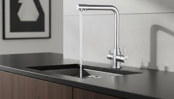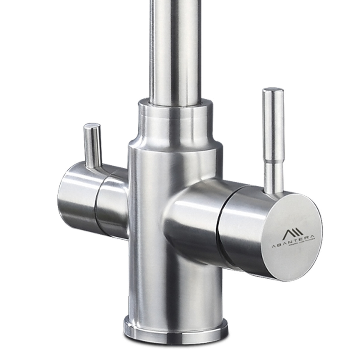 Grifo NORVIA, 3 Vias • Ósmosis Inversa • Acero Inoxidable Pulido • 2 Reductores de Caudal • Incluye: 3 Mangueras Metálicas de Servicio y Conexiones a tubos de 1/4 y 3/8
